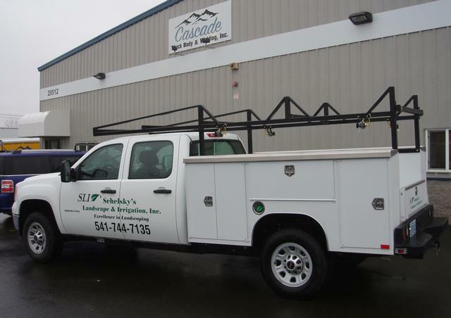 This Harbor Trademaster Service Body, mounted on a GMC Sierra Crew Cab was built by Cascade Truck Body and Trailer Sales, Eugene , Oregon. Built for Schelskys Landscape and Irrigation, it has a custom forklift loadable rack mounted to the service body and extending over the crew cab. Also note the rack-mounted ratchet straps to secure the load