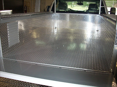 Now we come to the bling! Polished aluminum treadplate is attached to the standard stainless steel lids, and the cargo compartment and backwrappers are covered in the same shiny treadplate. Add to this an unusual, but gorgeous chrome rear bumper and you have one sweet looking truck. And we cannot forget the silver metallic base coat, clear coat paint job! It's a knockout! We're sure their strategy was more protection from scratched paint and rust, but the bling has other obvious benefits!