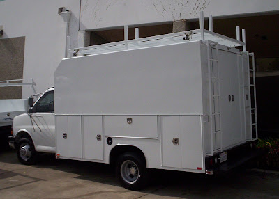 Kimberly at Harbor Truck Bodies sent me this photo of a WorkMaster plumber style body with a custom rack. Notice the rack has expanded metal fabric welded into the framwork and notice the dual ladders to get up there in the clouds and load that rack. Also see the Rackstraps (must be fun to use those. . .). Very interesting add-on indeed. See more interesting things at http://www.htbi.net/.