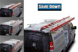 Slide-Down Ladder Rack easily lowers ladders to "within arms reach". Easy to use actuator handle pivots the ladder to the side of the van for safe, efficient operation. Adjustable to fit different extension ladders up to 32ft.
