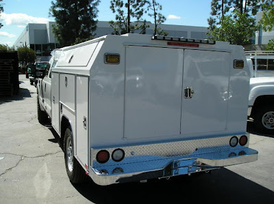 This is a very nice looking unit built for the City of Irvine by Harbor Truck Bodies. Notice the chrome plated rear bumper. Very nice. I absolutely love the upper side compartments that are angled with a long door. That used to be wasted space and now it can be very useful, but it has an additional benefit of giving the whole body a truck-matching appearance and I think it has a smooth flow.