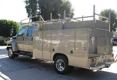 Mounted on a light brown metallic GMC 5500 Crew Cab, the Harbor 56" closed top body is enhanced with the addition of a 3-piece raised cargo bed enclosure. What do you suppose they put in there? Whatever they want, I'm sure since there is a ton of room in there. A couple of custom vise mounts, some fold-up steps mounted to the end panels, oversize tailgate, and a forklift loadable rack. Then we get around to the side and see all those beautiful HD drawers! I love drawers in service bodies. The unit also has Harbor's Master Lock System and 2-stage matching paint including inside the compartments.